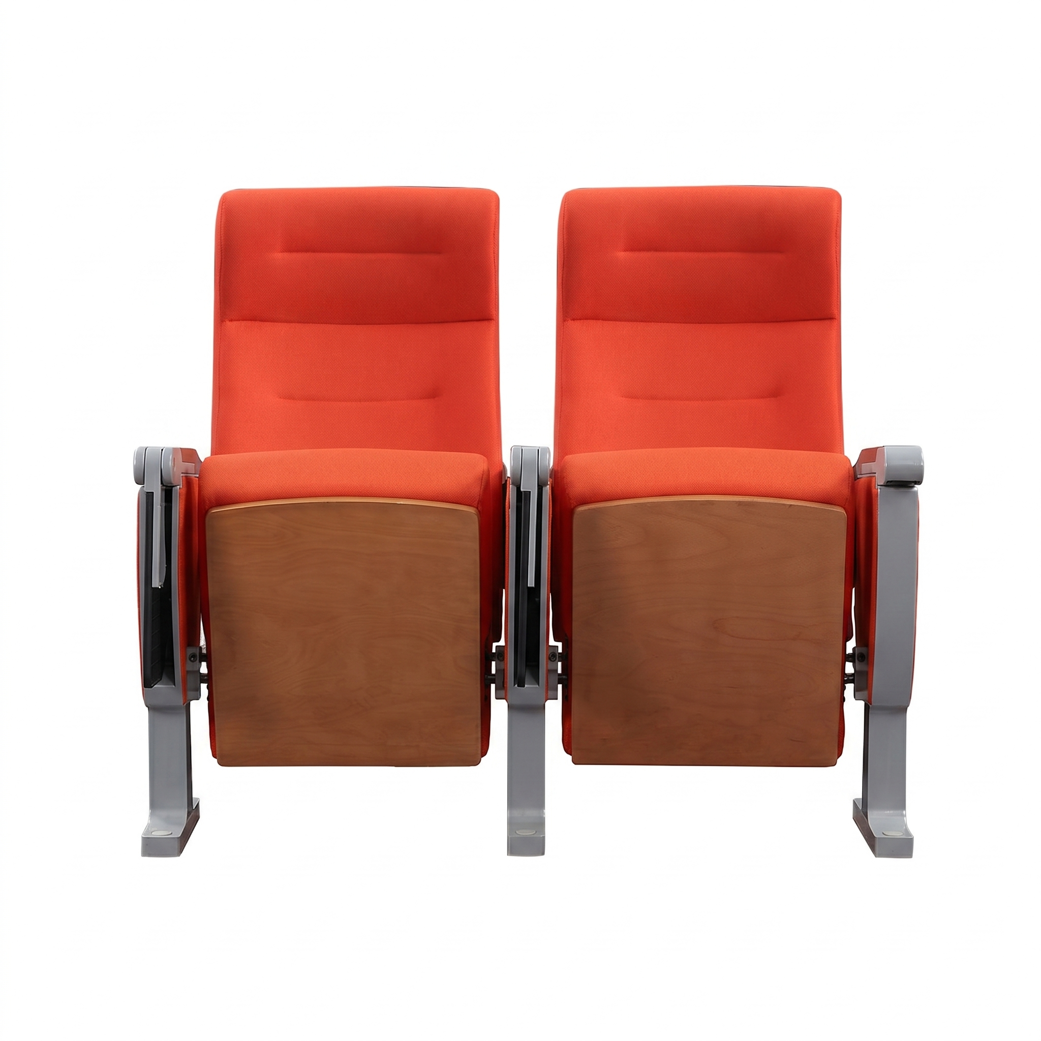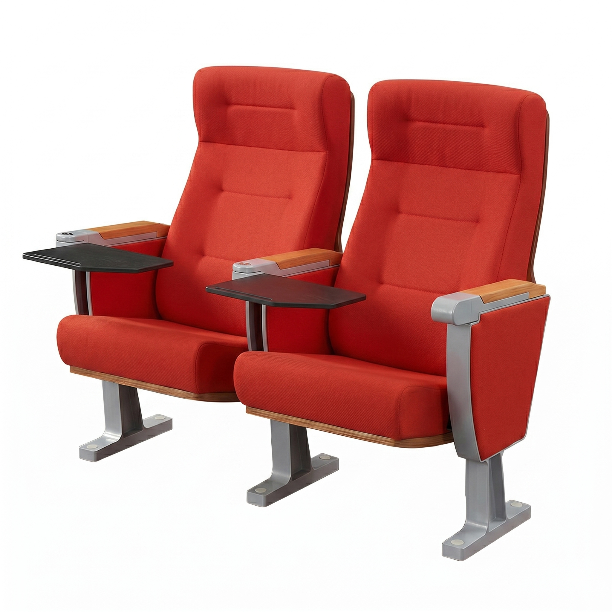 Elevate your lecture halls, theaters, or conference rooms with our premium auditorium seating. Designed for comfort and functionality, these vibrant red fabric chairs feature integrated writing tablets, perfect for note-taking during presentations or lectures. The modular linking system allows for flexible row configurations, while the durable, floor-mounted single pedestal design ensures stability and a clean aesthetic. Experience superior seating solutions that combine modern design with practical features for an optimal audience experience.