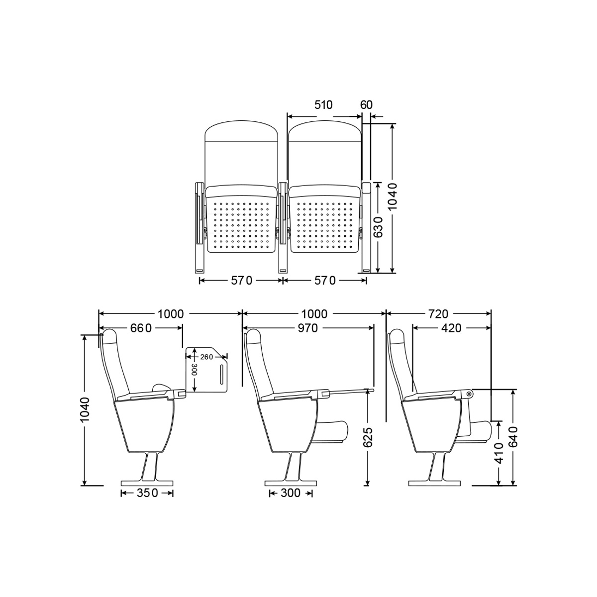 • Seat Width: 570 mm (center-to-center spacing) / 510 mm (actual cushion width)