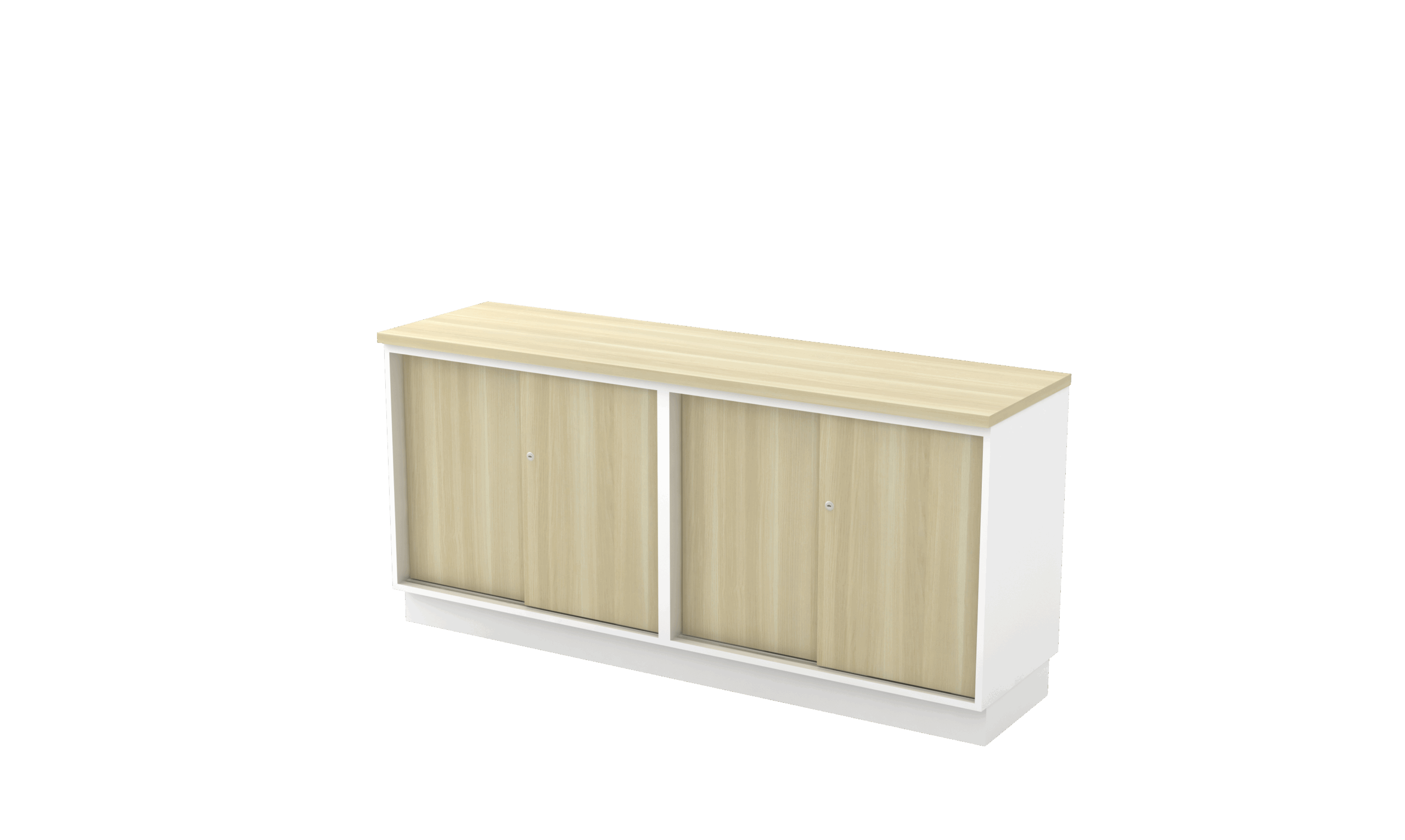 Wide low cabinet with dual sliding doors, designed for smooth access and space efficiency.
