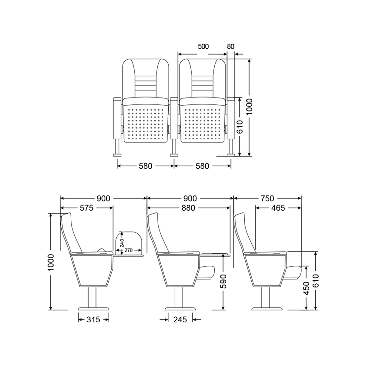 • Seat Width: 580 mm (center-to-center) or 500 mm (cushion width). The armrest width is specifically noted as 80 mm.