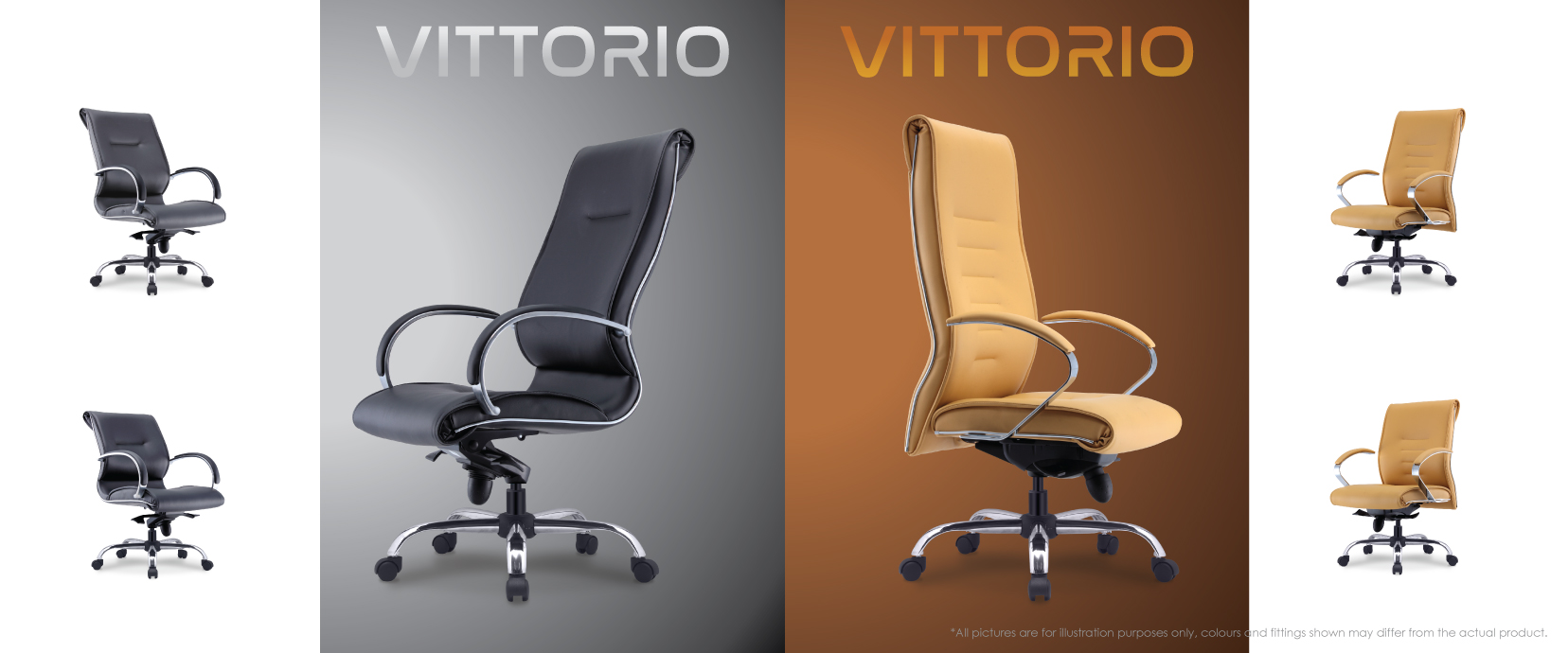 The VITTORIO Series embodies timeless executive style with ergonomic performance. Built with premium materials, it is available in two variants – Vittorio 1 with aluminium die-cast armrests with padding and kneetilt mechanism, and Vittorio 2 with chrome metal armrests with upholstered armpads and a synchronized mechanism.